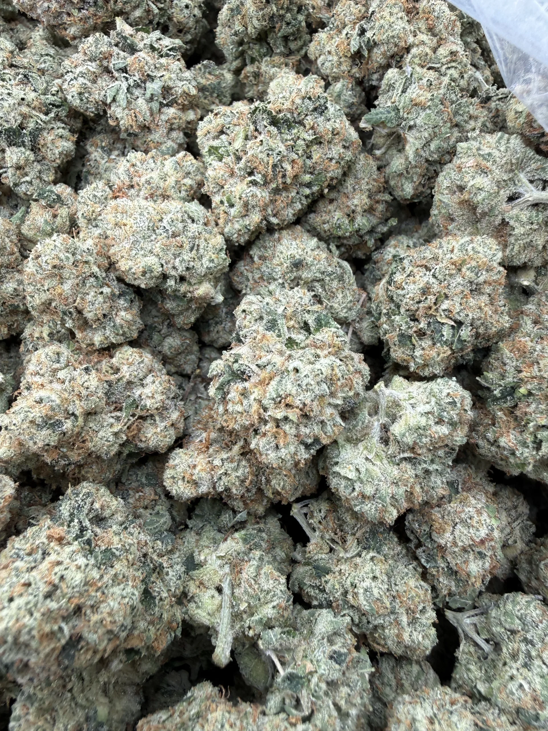 This Kosher Kush strain produces dense, rock-solid buds with a thick trichome blanket. The flowers show deep green tones with muted olive highlights, while burnt-orange pistils thread through each nug. Resin coverage is heavy and sticky, which is exactly what experienced Kush smokers expect.